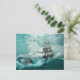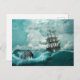Mande uma nota em estilo com estes bonitos cartões postais náuticos temidos. Esta design tem a sensação de uma velha pintura a óleo, representando um velho navio mercante/pirata no mar, resistido a uma tempestade em águas verdes azuis ricamente abarrotadas. O céu acima é escuro e nublado, e um barril e âncora são visíveis entre as ondas tempestuosas. Faz um presente excelente! Perfeito para amantes do oceano, navio, pirata e estilo náutico. Este design também está disponível em canecas de café, adesivos e canetas.