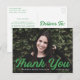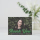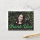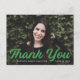 Obrigado de graduação simples e na moda com a foto horizontal do formando com "Obrigado" em um roteiro verde em negrito. Personalize a frente do obrigado de graduação de fotos que você faz no postal, adicionando o nome do formando, o nome da escola e o ano de graduação. O cartão postal reverte para exibir seu endereço de devolução e obrigado personalizado da mensagem.