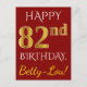 Este simples design de cartão postal de aniversário personalizado apresenta a mensagem "FELIZ ANIVERSÁRIO DE 82 ANOS", com o "82" tendo uma aparência semelhante a ouro. A frente também apresenta um nome personalizado e um fundo vermelho. O verso apresenta uma mensagem de aniversário personalizada, juntamente com o endereço personalizável do destinatário do cartão postal de aniversário. Poderia ser enviado a alguém que está celebrando seu aniversário de oitenta e dois anos.