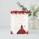 Este convite de aniversário de sweet sixteen elegante e glamoroso apresenta uma bela princesa com cabelos escuros e pele morena em um vestido de baile vermelho. O texto combina caligrafia manuscrita e fontes modernas sem serifa para uma aparência clássica e sofisticada. Os arranjos florais, borboletas e confetes dourados criam a combinação perfeita de rústico e chique.