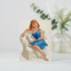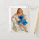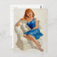Cartão PinUp Clássico mostrando uma bela Garota PinUp em um vestido azul quente sentado em um sofá, pintado por Arthur Sarnoff (1912-2000)