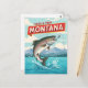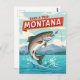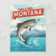 Uma ilustração do estilo de colheita mostra um grande robalo saltando de um rio com montanhas e árvores ao fundo. O texto diz "Tome uma Trip Montana".