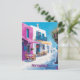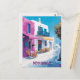 Este cartão postal de viagem mostra uma ilustração de uma rua inspirada por Mykonos, Grécia. Este cartão-postal é perfeito para os viajantes que planejam visitar Mykonos ou para aqueles que viajaram por Mykonos e enviaram um cartão-postal à sua família ou amigos.
