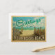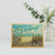 Este design de cartão-postal antigo Greetings From Indian Rocks Beach apresenta uma praia arenosa com uma bela água turquesa do oceano e acima do mar, um céu azul com nuvens brancas fofas. No estilo de viagens vintage.