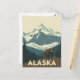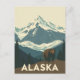 Esta ilustração gráfica incorpora um estilo de arte vetorial com sua simplicidade e sem detalhes intrincados, reminiscente de clássicos cartazes de viagem vintage. É a lembrança perfeita de uma aventura no Alasca, um presente ideal para entusiastas da vida selvagem, ou uma peça de arte retrô impressionante.