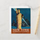 Viagens vintage de poster para Nova Iorque, mostrando a Estátua da Liberdade com barcos, linha do horizonte e luz de busca à distância, por volta de 1927.