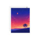 This striking postcard captures a dramatic twilight transition over a quiet hillside. The scene features a brilliant gradient sky moving from a warm, fiery orange at the horizon to a vivid magenta, then a deep indigo night sky dotted with stars and a luminous blood-red moon. A solitary tree stands in bold silhouette on a grassy ridge, overlooking a peaceful valley with distant blue mountain peaks. With its high-contrast color palette and dreamlike atmosphere, this artwork evokes a sense of magical evening solitude. This postcard is a perfect choice for sending a bold message, a contemplative greeting, or as a beautiful keepsake for those who love celestial landscapes.