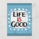 "A Vida É Boa" é um design de texto fofo em azul claro com texto preto e vermelho, juntamente com uma forma de destaque branca e pontos caprichosos texturizados brancos ao redor.
