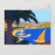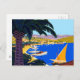 Anúncios de Viagem, em francês e europeu, em língua oficial - Praia, aldeia, pessoas, árvores, mar azul e ilustração do céu