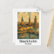 Volte no tempo com esta trabalho de arte viagens vintage num cartão postal de Estocolmo, Suecia, inspirado por posteres de viagens europeus clássicos do século médio. Apresentando a icônica frente d'água da cidade, os coloridos edifícios Gamla Stan e o charme escandinavo eterno, este retrô design celebra beleza e a cultura da capital da Suecia.