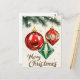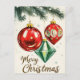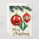 Este cartão postal de Natal apresenta três ornamentos vibrantes pendurados em galhos verdes e poeirentos. Dois ornamentos são clássicos de vermelho com acabamentos brilhantes, enquanto o terceiro é uma decoração verde em forma de diamante. Os ornamentos vermelhos incluem uma bola redonda com pequenos faíscas tipo estrela e outra com forma de lágrima, decorada com padrões circulares. Sob os ornamentos, as palavras "Feliz Natal" são escritas em uma elegante fonte de ouro brilhante. O fundo é ligeiramente aspergido com estrelas pequenas e flocos de neve, dando ao cartão-postal uma sensação festiva e alegre de feriado.