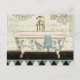 © Lisa Audit/Wild Apple. Esta imagem de uma banheira francesa azul e branca apresenta uma toalha ao lado, assim como algum texto francês na imagem.