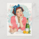 A glamorous vintage-style woman lounges thoughtfully, holding a glass of pink champagne. Her red curls, bold lips, and blue bow stand out against soft pastel splashes that enhance the nostalgic mood. A bottle of pink champagne with bright citrus accents adds elegance and charm, blending retro allure with a fresh, modern touch.