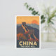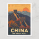 Journey back in time with this captivating vintage travel poster style postcard featuring The Great Wall of China. The iconic ancient fortification is depicted winding across rugged mountains, bathed in the warm glow of a setting sun. Rich autumnal trees in shades of orange and red add a vibrant touch to the historic landscape. This design is perfect for sending postcards from China, decorating a travel-themed room, or adding to a collection of retro-inspired art. A great memento for history buffs, world travelers, and lovers of classic aesthetics.
