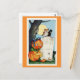 Mande saudações de Halloween para sua família e amigos com este cartão postal de Dia das Bruxas bonitinho com uma ilustração retrô de uma abóbora em um cemitério com animais como um gato preto, uma coruja e um pássaro negro!