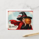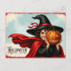 Este é um cartão postal de Halloween, estilo vintage, com uma orientação horizontal, concebido para parecer envelhecido com uma fronteira vermelha angustiada. O tema principal é uma jovem, vestida de bruxa, segurando uma abóbora entalhada. A menina tem cabelo escuro, encaracolado e uma pele pálida com bochechas rosadas. Ela veste um chapéu grande, pontiagudo de bruxa negra com uma fita vermelha e uma volumosa capa vermelha que corta em volta dos ombros. Ela está olhando para o espectador com um sorriso coxo e brincalhão. Ela segura um clássico jack-o-lanterno com olhos triangulares e uma boca larga e sorrateira. A abóbora está acesa por dentro, dando um brilho quente. No canto inferior esquerdo da imagem, a palavra "Hallowe'en" é escrita em uma escrita decorativa, em estilo gótico. O fundo é um azul claro e macio com uma sugestão de nuvens. A imagem inteira tem uma aparência texturizada, colorida à mão, dando-lhe uma sensação encantadora e nostálgica.