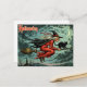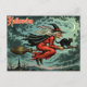 Este é um cartão postal horizontal do Dia das Bruxas com um estilo vintage, colorido à mão, projetado para se parecer com um pedaço clássico de efemia do Dia das Bruxas. A imagem central é a caricatura de uma bruxa voando sobre uma vassoura, com seu gato preto como companheiro. A bruxa tem um nariz longo, viciado, um queixo proeminente, e um sorriso meio malicioso. Seu cabelo longo, branco e seu vestido vermelho estão fluindo dramaticamente, como se pegos em um vento forte. Ela veste um chapéu preto alto e pontiagudo com uma fita vermelha. Seu gato preto, com sua cauda arregada alta, fica atrás dela na vassoura, olhando para o lado. A cena é colocada contra um céu noturno escuro e girando com uma lua crescente pálida no canto superior direito. Abaixo, uma pequena vila com uma torre de igreja é visível no horizonte, suas luzes brilhando. O canto superior esquerdo do cartão postal tem a palavra "Hallowe'en" em uma letra decorativa e avermelhada. Toda a imagem tem uma textura ligeiramente granulosa, envelhecida, e as cores são vibrantes, mas enlameadas, dando-lhe um encanto nostálgico e ligeiramente assustador.