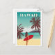Qualquer um adoraria receber este postal viagens vintage com uma ilustração retrógrada de uma mulher surfando em uma praia e oceano no Havaí!