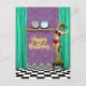 A vinheta divertida e divertida apresenta "Parabéns" em fonte neon com uma mulher vintage de biquíni bonitinha em cadeira...vamos também não se esqueça de notar o peixe-dourado saltando da multidão para sua própria tigela! Fale sobre cartões de aniversários únicos!