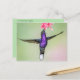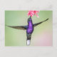 Cartão postal com o belo sabrewing hummingbird violeta alimentado a partir de uma flor rosa com as asas estendidas. Este espantoso beija-flor é uma preferencialmente grande, com penas roxas profundas e pontas brancas nas suas penas exteriores. Cartão único e bonito para beija-flor, jardim e amantes da natureza. Foto tirada em Bosque de Paz Reserva Biologica, Valle del Rio Toro, Alajuela, Costa Rica.