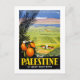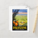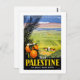 Reprodução restaurada e melhorada digitalmente de um poster de viagens da Palestina mostrando laranjas e frondes de palmeiras contra uma visão de terra arável, um corpo de água e montanhas com capas de neve. Imperfeições removidas. Cores corrigidas. Imagem cortesia da Biblioteca do Congresso.