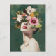 Uma trabalho de arte digital cativante de uma mulher com flores e uma verde esmagadora adorando seu rosto, obscurecendo seus olhos e criando um senso de mistério e conexão com a natureza. Suas feições suaves e estilizadas contrastam com as vibrantes flores e folhagem, enquanto o rico fundo verde destaca a beleza de sua coroa floral. A composição mescla surrealismo e elegância, incorporando uma harmonia entre forma humana e natureza.
