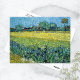 Um cartão postal com a pintura, View of Arles with Irises (1888), do artista holandês Vincent van Gogh (1853-1890) - Uma bela paisagem de campos de trigo ao lado de um prado de grama e uma fileira de flores de íris no primeiro plano.
