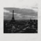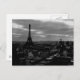 Fotografia em preto e branco mostrando uma vista sobre Paris, com a Torre Eiffel. A atmosfera é escura e estranha.