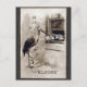 As mãos "Bem-vindas" estão a abrir uma janela para aceitar uma entrega de uma cegonha neste anúncio de nascimento de 1909.