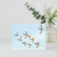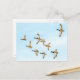 Dez patos-reais voam em formação através de um céu azul brilhante.