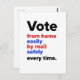 Votar pelo correio tem muitas vantagens! As pessoas podem precisar de algum incentivo para fazer a mudança, e alguns estados exigem que os eleitores requeiram votação por e-mail em cada eleição. Este cartão pode ser utilizado antes dos prazos de apresentação dos pedidos de escrutínio e dos prazos de escrutínio, dependendo da mensagem. Certifique-se de definir a quantidade no carrinho para pedir cartões suficientes para passar pela sua lista!