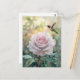 Este cartão-postal apresenta uma delicada pintura aquosa de um beija-flor vibrante pairando perto de uma rosa-rosa macia na flor do cheio. As asas do beija-flor são um borrão de vermelhos e verdes iridescentes, contrastando lindamente com as pétalas gentis da rosa. As matizes macios e pinceladas fluidas criam um sentimento sonhador, romântico, perfeito por enviar uma mensagem sincera ou manter como obra de arte.