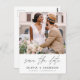 Foto moderna e elegante Guarde o Cartão de Casamento de Data. O cartão de convite para salvar a data inclui tipografia branca com Mão-esticada e chic e design simples em um fundo branco para o qual você pode adicionar sua fotografia personalizada de noivado.