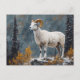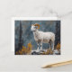Um carneiro branco com chifres magníficos em um terreno nevado cercado por coníferas altas e folhagem vibrante, exuberando força e admiração em um cenário de montanha viticulosa e selvagem.