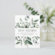 Esta mudança botânica na moda do postal de endereço apresenta um quadro de folhas verdes em aquarela abundantes sobre fundo branco. As palavras "novo endereço" aparecem na moda, em texto elegante. Um anúncio maravilhoso e comovente que você terá orgulho de enviar para amigos e família.