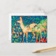 Cartão-postal num design de cervo da tapeçaria William Morris num cenário de floresta de fantasia - veado bronzeado num fundo azul e verde luxuoso de folhas e flores, acentuado com tulipas vermelhas