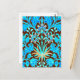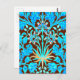 Cartão-postal em uma safra do padrão William Morris de hiacintas, tulipas e folhas, em tons de aqua macio e azul-ceruliano, acentuados com cor-de-rosa e laranja, sobre fundo castanho-chocolate escuro