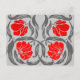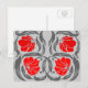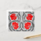 Cartão postal em um padrão de tecido vintage de William Morris de flores e folhas de pimpinela estilizadas - flores em um gradiente de vermelho escuro a brilhante, com folhas cinza grafite / cinza, em um fundo cinza prateado claro