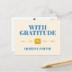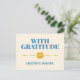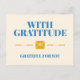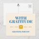 This sincere and heartfelt postcard has a thoughtful message of appreciation "With gratitude grateful for you". It has a blue typography design with yellow envelope and design elements on a soft cream background.