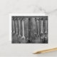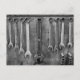 Uma fotografia a preto e branco de ferramentas bem ordenadas penduradas num conselho de madeira.