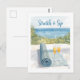 Convide seus convidados para um dia de mindfulness e mimosas com este elegante convite de cartão postal em aquarela, apresentando um cenário oceânico tranquilo. O design exibe tons suaves de azul pastel e bege arenoso, com uma silhueta graciosa de yoga se estendendo perto da beira da água. No topo, uma bela caligrafia dourada diz “Stretch and Sip”, capturando o espírito de equilíbrio, relaxamento e diversão. Perfeito para brunch de yoga, retiros de spa, eventos de bem-estar na praia ou encontros de despedida de solteira mindful.