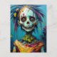 This eerie zombie doll artwork features wide yellow eyes, tattered layered clothing, and wild, tangled hair with skull accessories. Set against a painterly teal backdrop, it’s a creepy and captivating design for Halloween collectors and horror fans alike.