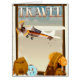 Viagens vintage de Poster - poster clássico de férias de uma aeronave leve voando, há uma mochila no primeiro plano que é emoldurada por madeira velha.
