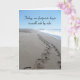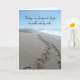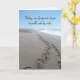 A mensagem na frente deste cartão de pré-casamento diz, "Hoje, nossas pegadas começam a andar lado a lado." A mensagem dentro deste cartão diz, "Mal posso esperar para juntar a minha vida à sua. Eu te amo." Este cartão pré-casamento para a noiva ou noiva mostra uma praia da Califórnia e uma cena oceânica com um adorável céu azul. Há dois conjuntos de pegadas caminhando pela praia lado a lado.