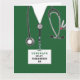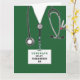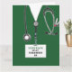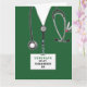 Cartão de formatura de uma escola de enfermagem criativo com um único esfregão verde hospitalar, um estetoscópio e um canivete suíço. Para personalizar o texto de edição para adicionar o nome da enfermeira.