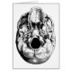 Vista baixa anatômica de um crânio humano em preto & no branco.