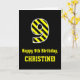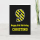 A frente deste design de cartão de saudação ousado e atencioso com tema de aniversário apresenta um grande número "9", com um padrão de listras amarela e preta. Também apresenta a mensagem "Feliz 9.º aniversário", e um nome personalizável. O fundo da frente é preto colorido. O dentro apresenta uma mensagem de saudação de aniversário personalizada, ou talvez possa ser apagado e deixado o vazio se uma mensagem for escrita manualmente. Um cartão de aniversário personalizável como este pode ser uma maneira divertida de enviar uma mensagem para celebrar o nono aniversário de alguém. [~Z0000382]