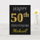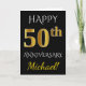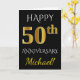 Este simples design de cartão de felicitações de aniversário de casamento personalizado apresenta a mensagem "FELIZ 50º ANIVERSÁRIO", com o "50º" tendo uma aparência semelhante a ouro falso. A frente também apresenta um nome personalizado e um fundo preto. O interior apresenta uma mensagem de felicitações de aniversário de casamento personalizada. Pode ser dado a um marido ou esposa em celebração do quinquagésimo aniversário de casamento do casal. [~Z0000076]