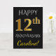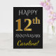 Este simples e personalizado design de cartão de saudação de aniversário de casamento apresenta a mensagem "FELIZ 12º ANIVERSÁRIO", com o "12º" tendo uma aparência semelhante ao ouro. A frente também apresenta um nome personalizado e um fundo preto. O interior apresenta uma mensagem personalizada de aniversário de casamento. Poderia ser dado ao marido ou à esposa em celebração do décimo segundo aniversário de casamento do casal.