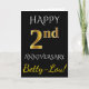 Este simples e personalizado design de cartão de felicitações de aniversário de casamento apresenta a mensagem "FELIZ 2º ANIVERSÁRIO", com o "2º" tendo uma aparência semelhante a ouro. A frente também apresenta um nome personalizado e um fundo preto. O interior apresenta uma mensagem personalizada de aniversário de casamento. Poderia ser dado a um marido ou uma esposa em celebração do segundo aniversário de casamento do casal.